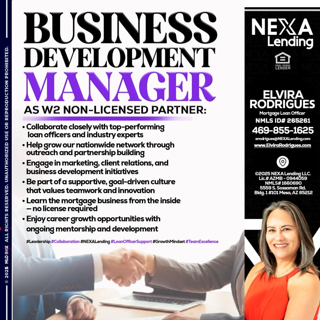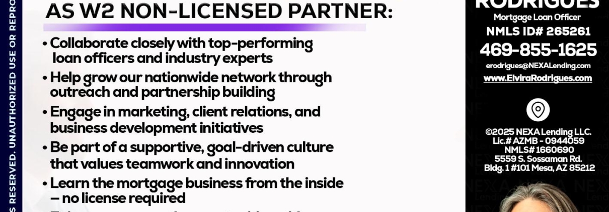 business development - Elvira Rodrigues -Mortgage Loan OfficerHi, my name is Elvira Rodrigues. I’m a Loan Officer with NEXA Mortgage LLC., offering personalized mortgage solutions, fast customized quotes, great rates and service with integrity.