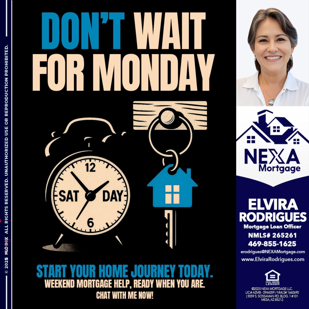 DONT WAIT FOR MONDAY - Elvira Rodrigues -Mortgage Loan OfficerHi, my name is Elvira Rodrigues. I’m a Loan Officer with NEXA Mortgage LLC., offering personalized mortgage solutions, fast customized quotes, great rates and service with integrity.