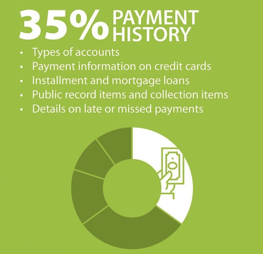 35%Paying debt on time and in full has a positive impact. Late payments, judgments, charge-offs, collection accounts and bankruptcies have a negative impact.
