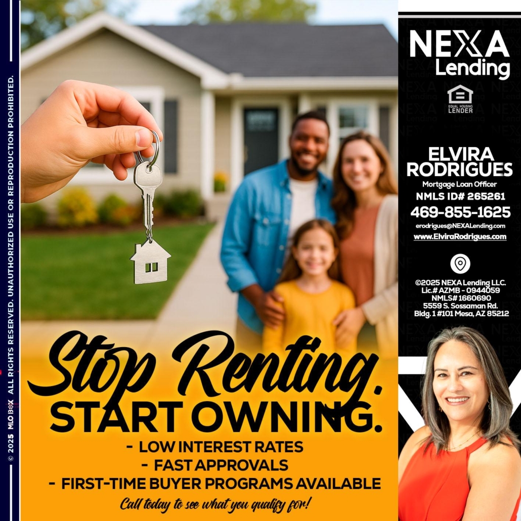Hi, my name is Elvira Rodrigues. I’m a Loan Officer with NEXA Mortgage LLC., offering personalized mortgage solutions, fast customized quotes, great rates and service with integrity.